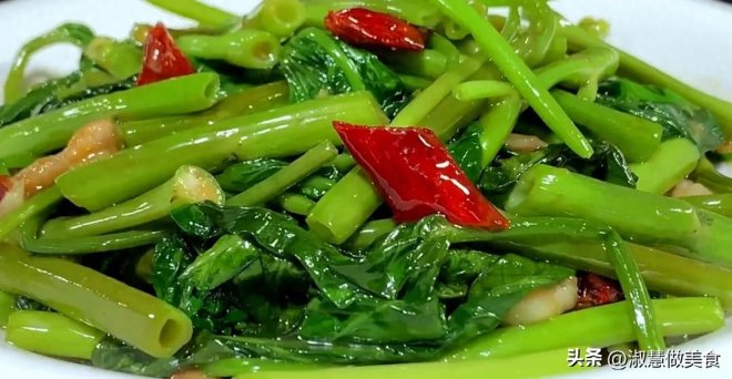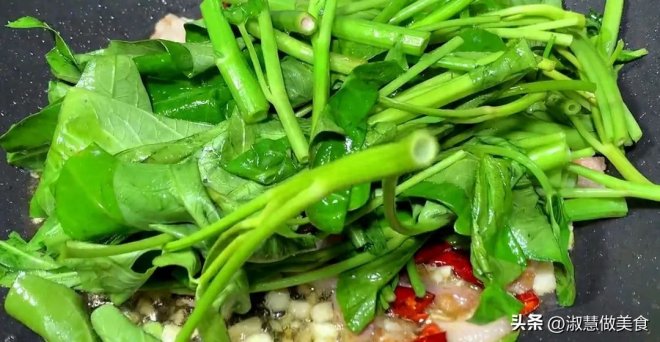 6.把調好的料汁一起加進來,把空心菜給它炒香就差不多了,一道鮮嫩又好吃的空心菜我們就這樣做好了,而且顏色也非常的翠綠。