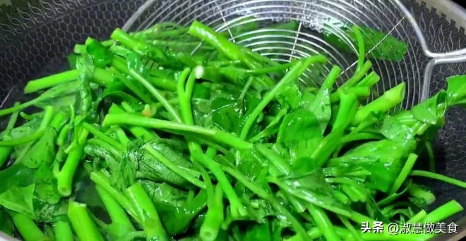 4.把水燒開,加入一勺食用鹽、一勺食用油,把切好的空心菜趕放入鍋中給它焯水,大概是在十秒鐘左右,它控水撈出來。