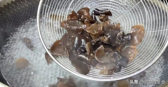 5.鍋中的水燒開,加入一勺食用油鹽,把木耳加進來,大概焯水一分鐘之後,控水撈出來切放一邊。