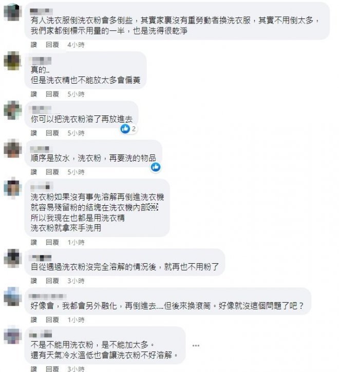 文章發布後不久,有發生過類似案例的網友留言,「會卡在底部厚厚一層」、「我都用粉,結果在拆洗衣機清洗的時候,看到滿桶的粉結塊⋯」、「拿出來洗簡直惡夢,跟蚵架一樣」、「沒融化很恐怖,之後我就改用洗衣精了」。有人也說明,例如粉類、水晶皂液、小蘇打都會造成卡粉,同時也提出解決方法,指出直立式洗衣機較易出現狀況,若能調高水溫,依水、粉、衣服的順序放入,並控制用粉量,就能改善這個問題。