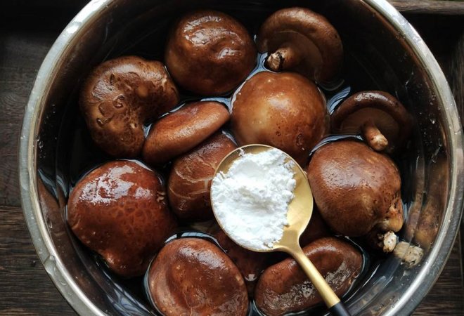 首先,我們先找一個盆,放入香菇,接一盆水,然後放入兩勺澱粉,就是我們平時家裡常用到的澱粉,攪拌均勻,浸泡10分鐘。