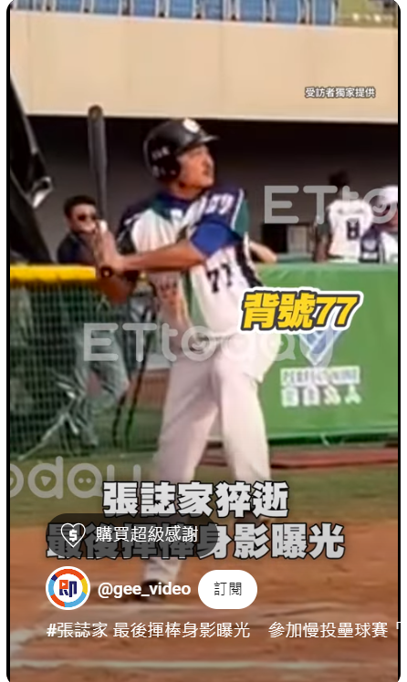 另外,據《ETtoday新聞雲》報導,張誌家生前最後一次揮棒的身影也跟著曝光,他在去年12月30號參與廣東中山2022-2023「熊貓盃」-中國慢投壘球企業聯賽,代表深圳信隆健康出賽,當時有人拍下他穿著背號77號的球衣,雖然身形相較過去圓潤不少,但精神看起來都還不錯,也替球隊贏得不少加分機會。