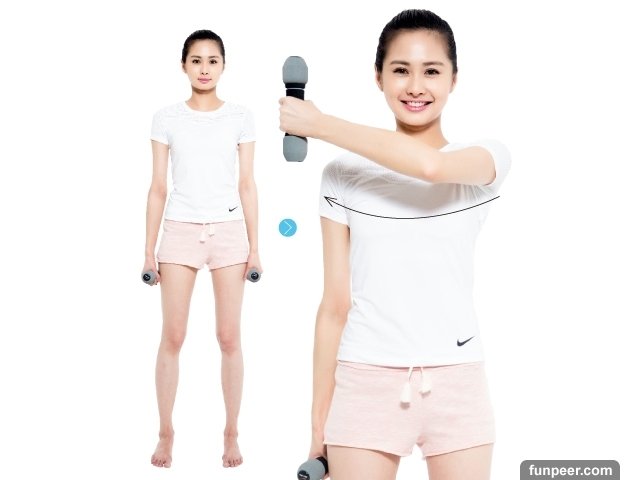 2.單臂胸前平舉Step1. 單手手持適當重量的啞鈴並採站姿,手臂自然垂下,掌心朝後手肘微彎預備。Step2. 上舉時吐氣,將重量平舉至另一側的肩膀上方,手肘約略與肩膀同高,於最高點停留3-5秒,感受到鎖骨附近的胸肌及上臂肌肉用力微痠後,吐氣回到起始位置。適當休息後換邊,並反覆做3-5次。