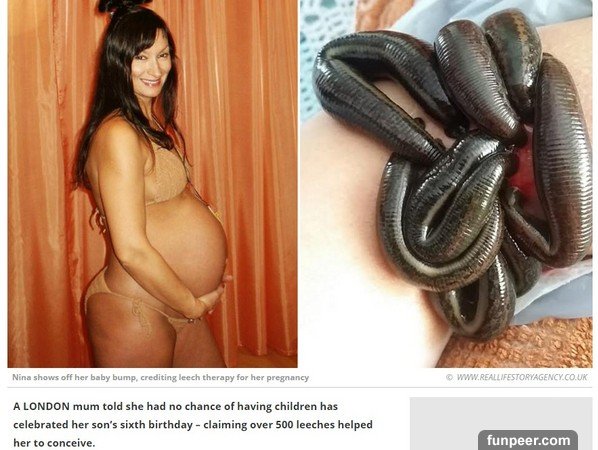 英國倫敦50歲的妮娜(Nina Evans)因為患有子宮肌瘤無法順利受孕,竟然嘗試另類療法將水蛭放入子宮頸吸血,持續了8個月後,共用掉了500隻水蛭,她聲稱自己45歲時是因為療法奏效而順利懷孕,不但神奇的消失了一顆肌瘤還生下了一個兒子。