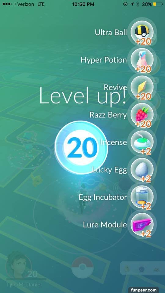 美國網友分享的level 20獎勵 Hyper Potion +20, Revive +20, Razz Berry +20, Incense +2, Lucky Egg +2, Egg Incubator +2, Lure Module +2 最重要的應該是經驗值加倍道具跟孵蛋器了!!! 壞消息是背包不課金真的裝不下:( \