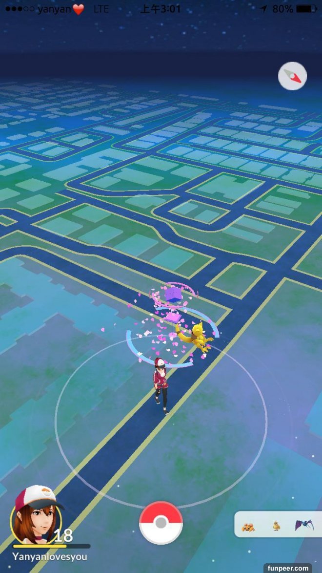 按住,然後扔出去?比這個還是要複雜一點點。 先按住球,然後等內圈最大的時候 扔出去,儘量扔到內圈裡面, 越靠圓圈中心,捕獲機率越高 (扔球的時候給的Nice/Great/Excellent就是根據這個打靶的準確度給的)\