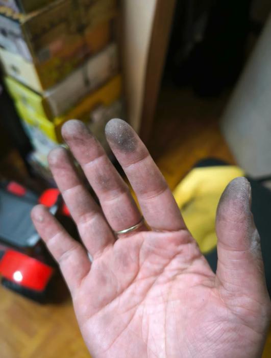 沒想到由於零錢的數量太多,即便全家4人一起投入清點,仍數了一個多小時才完成。而他也因為多次抓取硬幣,造成手掌、手指都被污漬沾染,自嘲地拍下照片,「數錢數到手發黑」。