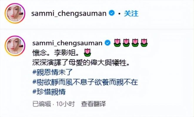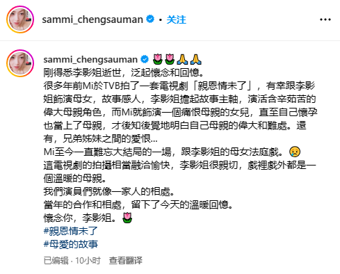 鄭秀文曾和李影飾演「母女」,她發文悼念表示兩人合作融洽愉快,李影戲裡戲外都是一個溫柔的母親。