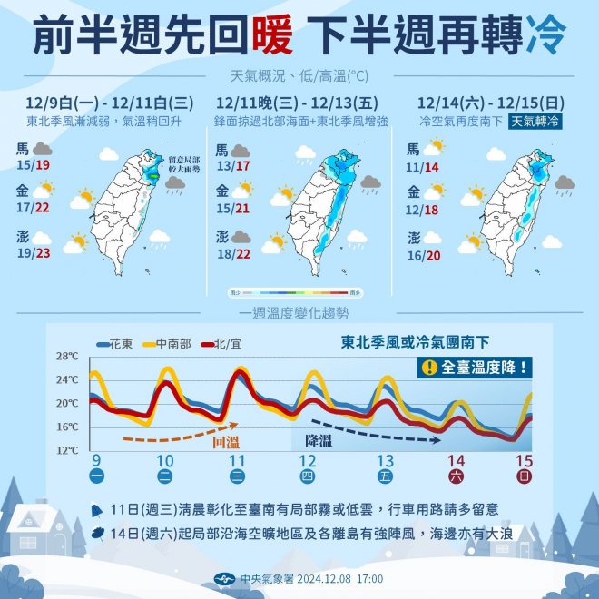 據了解,這波寒流影響時間預計持續到下週一,週四及週六將分別迎來兩階段明顯降溫。專家特別提醒,明後天空氣品質將從南部逐漸往中部轉差,部分地區可能會出現橘色警戒,民眾外出時需特別留意。