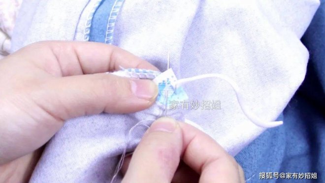 接下來,我們找到被芯的四個角,然後在這四個角的位置分別用針線縫上一個掛耳繩。剛剛的掛耳繩上,我們都有預留一點口罩布,就可以在預留的口罩布上縫針,把掛耳繩固定在被芯的四個角上。