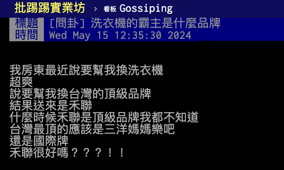 根據《中時新聞網》報導,有名在外租屋的網友近日在「PTT論壇」發文,表示房東主動提起要更換洗衣機,還說要換台灣頂級品牌,讓他聽了覺得超爽,沒想到送來卻跟想像的不一樣,竟然是禾聯的洗衣機,傻眼反問:「什麼時候禾聯是頂級品牌,我都不知道!」驚呼表示台灣最頂的應該是「台灣三洋媽媽樂」才對。